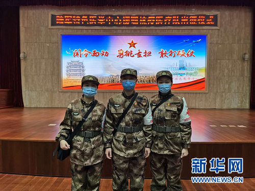 出征仪式上,陈客宏(中)与战友合影。新华网发 受访者供图