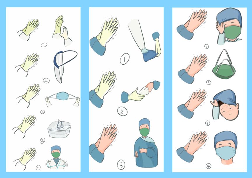 △廖佳颖连夜为保洁阿姨专属定制的脱防护装备的流程图,这份特别的流程图贴在隔离通道内队员所用的文字流程图边。
