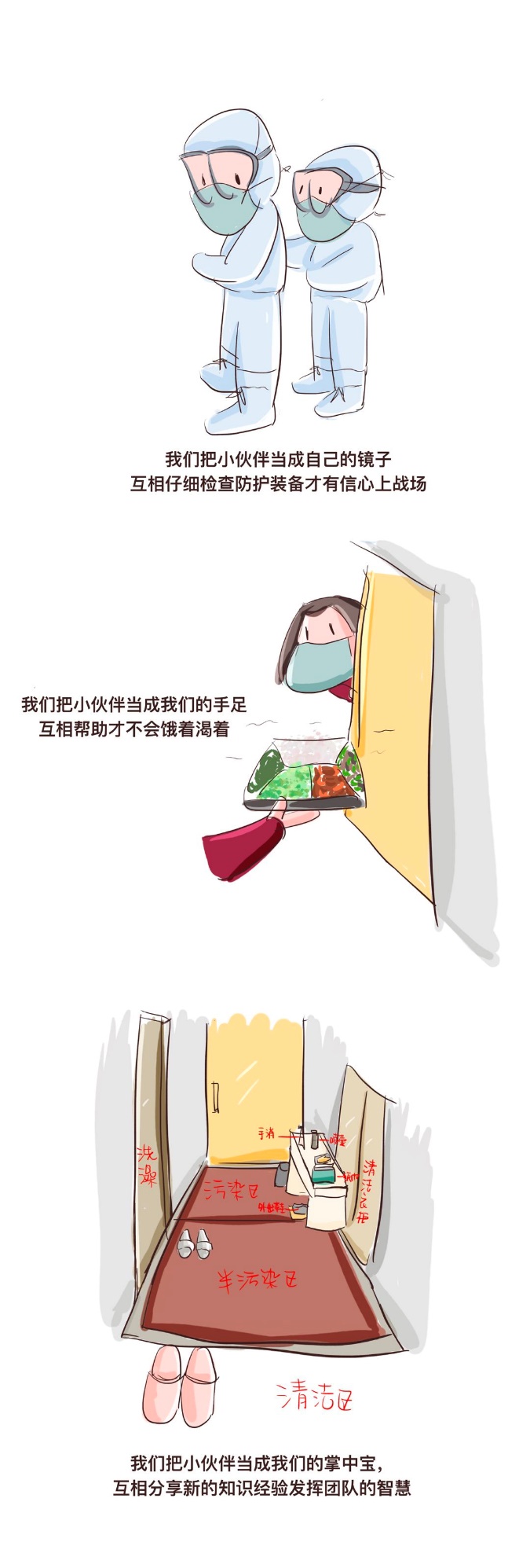 “都说星星是最闪亮的,那是因为没有看过护士的眼睛。你听过这句话吗?”廖佳颖在电话那头反问记者?;颊卟恢?,防护服背后的面容,他们能看到的永远是一双双充满笑意的眼睛,廖佳颖在画里写道:希望我们能像“大白”一样温暖你。这一场站疫中她对未来有了更多思考:希望患者康复后在接下来的日子中好好地生活,用她的话就是“该吃吃该喝喝,啥事儿别往心里搁”;希望能有更加和谐的医患关系,因为每一方都不容易;希望疫情过后加强对医务人员心理?;稍ず托睦硎璧?;希望更多的人能学医……