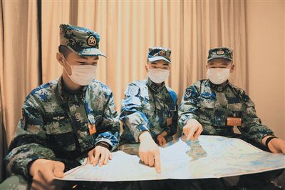 图为马鑫龙、徐锐、刘文康(从左至右)三人对照地图规划第二天的行车路线。周晓辉摄(人民视觉)