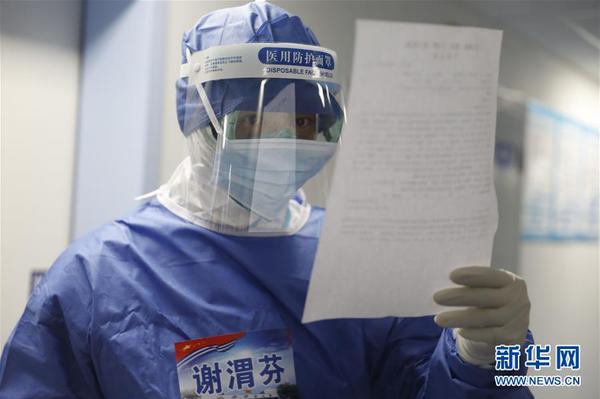 3月14日,谢渭芬检查患者治疗记录。 新华社发(曹希 摄)