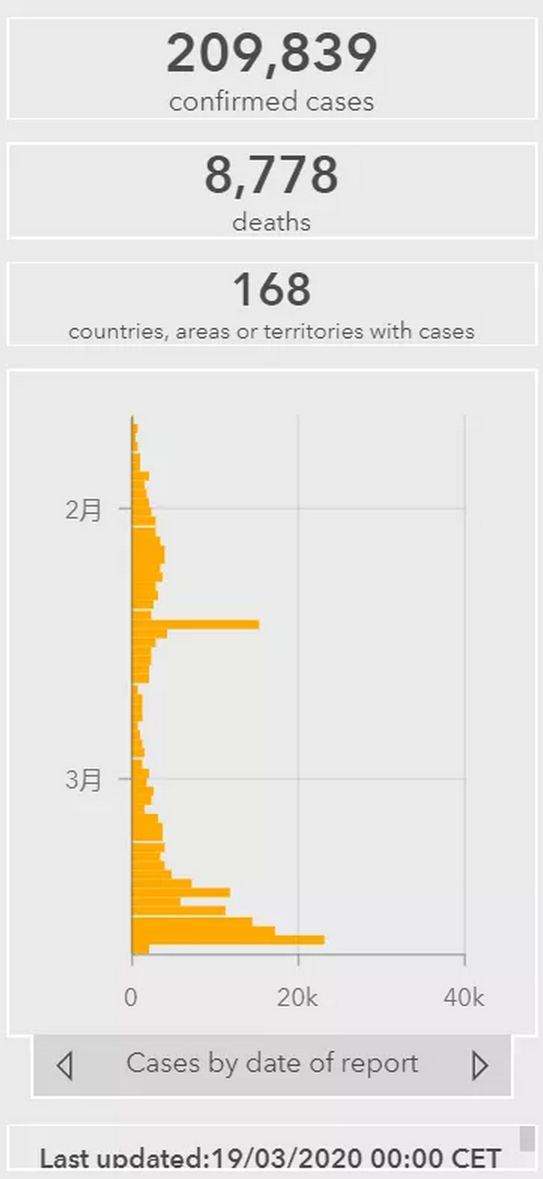 世卫组织发布最新一期新冠肺炎每日疫情报告,截至欧洲中部时间3月19日0时(北京时间7时),全球累计确诊209839例(新增16556例),死亡8778例(新增828例)。其中欧洲区域新增病例最多,累计已达87108例(新增10211例),死亡4084例(新增591例),死亡人数已超过西太平洋区域(中国在世卫数据划分中所属区域)。