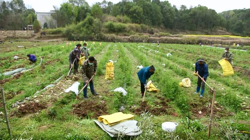 接到本来集团购销订单后,贫困户一起挖香芋。
