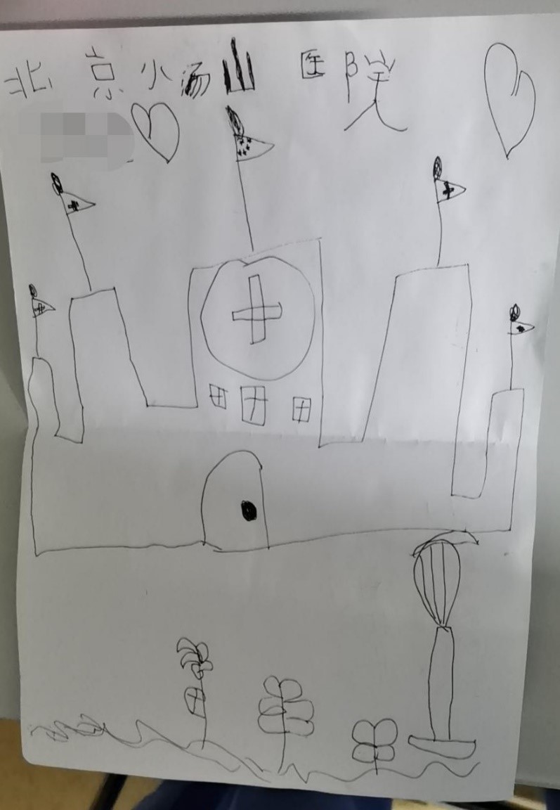 “孩子不要害怕,我们和皮卡丘都在陪伴你?!钡被な棵前颜壑剿透≡诓∏锏?岁小鱼(化名)时,小鱼拿着皮卡丘爱不释手,她回赠给护士们一副名为“小汤山医院”的画,画中的小汤山医院被一颗颗爱心包围,房顶上插五星红旗,医院前面有鲜花、帆船和气球。孩子心中的小汤山医院如同童话里的城堡。