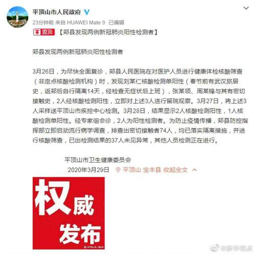 3月26日,为尽快全面复诊,郏县人民医院在对医护人员进行健康体检核酸筛查(非定点核酸检测机构)时,发现刘某仁核酸检测单阳性(春节前有武汉旅居史,返郏后自行隔离14天,经检查无症状后上班),张某领、周某锋与其有密切接触史,2人经核酸检测阳性,立即对上述3人进行留院观察。3月27日,将上述3人采样送平顶山市疾控中心检测。3月28日,结果显示2人核酸检测阳性,1人核酸检测单阳性。经专家组会诊,2人为阳性检测者。为防止疫情传播,郏县防控指挥部立即启动流行病学调查,排查出密切接触者74人,均已落实隔离措施,并进行核酸筛查,已出检测结果的37人未见异常,其他人员检测正在进行。