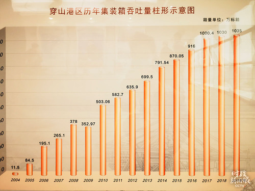 △柱形图清晰展示了2004—2019年穿山港区集装箱吞吐量的增长(总台央视记者史伟拍摄)