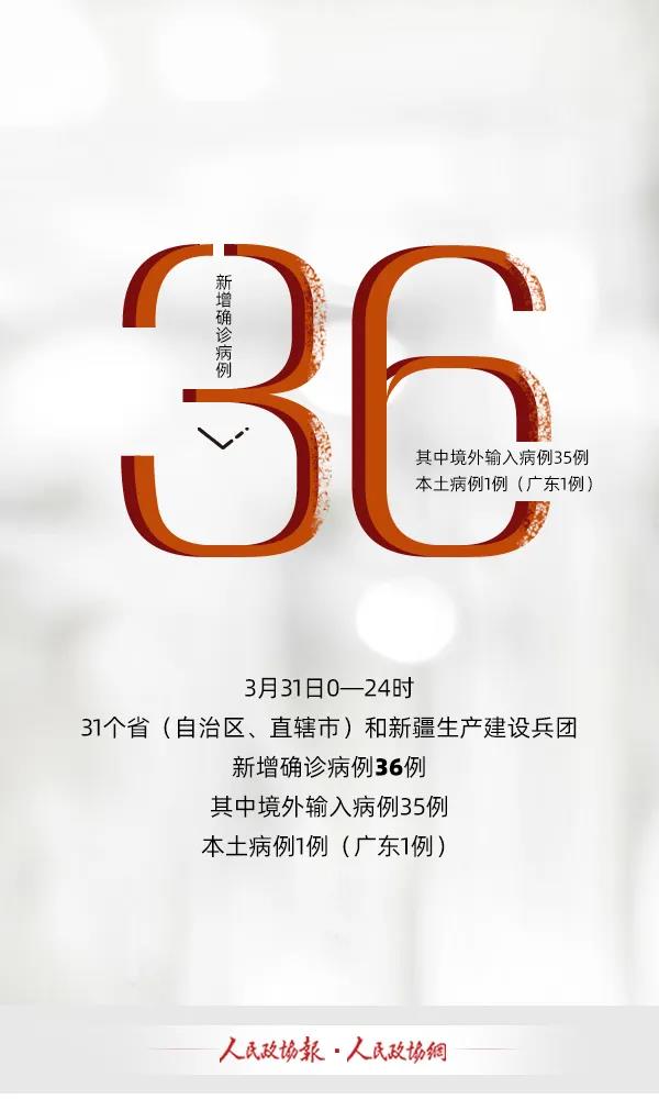 3月31日0—24时,31个?。ㄗ灾吻?、直辖市)和新疆生产建设兵团报告新增确诊病例36例,其中境外输入病例35例,本土病例1例(广东1例);新增死亡病例7例(湖北6例,上海1例);新增疑似病例26例,均为境外输入病例。 当日新增治愈出院病例186例,解除医学观察的密切接触者1418人,重症病例减少62例。 境外输入现有确诊病例691例(含重症病例20例),现有疑似病例169例。累计确诊病例806例,累计治愈出院病例115例,累计死亡病例0例。 截至3月31日24时,据31个?。ㄗ灾吻?、直辖市)和新疆生产建设兵团报告,现有确诊病例2004例(含重症病例466例),现有疑似病例172例。累计确诊病例81554例,累计治愈出院病例76238例,累计死亡病例3312例,累计追踪到密切接触者707913人,尚在医学观察的密切接触者20314人。 湖北新增确诊病例1例(武汉1例,为境外输入病例),新增治愈出院病例173例(武汉173例),新增死亡病例6例(武汉5例),现有确诊病例1283例(武汉1279例),其中重症病例435例(武汉432例)。累计治愈出院病例63326例(武汉46175例),累计死亡病例3193例(武汉2553例),累计确诊病例67802例(武汉50007例)。新增疑似病例0例(武汉0例),现有疑似病例0例(武汉0例)。 31个?。ㄗ灾吻?、直辖市)和新疆生产建设兵团报告新增无症状感染者130例,当日转为确诊病例2例,当日解除隔离302例。尚在医学观察无症状感染者1367例,比前一日减少174例。 累计收到港澳台地区通报确诊病例1077例:香港特别行政区714例(出院128例,死亡4例),澳门特别行政区41例(出院10例),台湾地区322例(出院39例,死亡5例)。