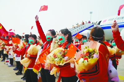 一下飞机受到热烈欢迎,北京医疗队队员脸上的笑容戴着口罩也藏不住。本报记者 程功 摄
