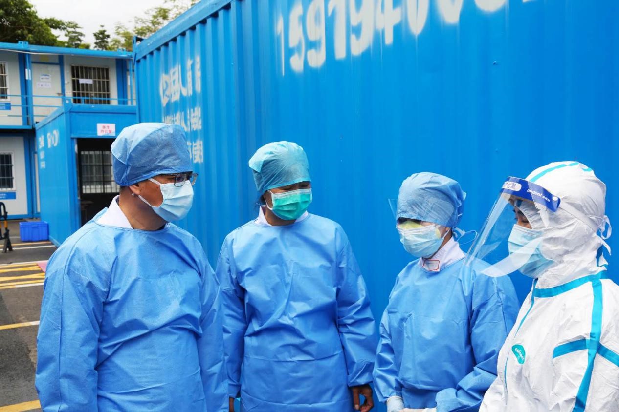 黄俊芳委员在隔离病区督导检查工作(左一)