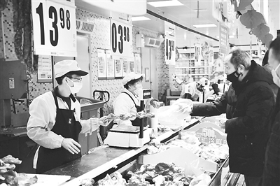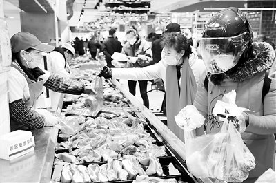 近来,各地采取多种措施,在疫情防控期间保障猪肉市场供应,满足居民消费需求。图为市民在河南省郑州市一家大型超市内采购猪肉。 新华社记者 冯大鹏摄 |
