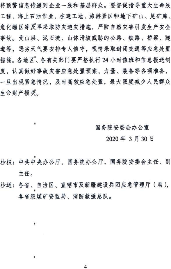 国务院安委会办公室在第四点中指出,受山洪、泥石流、山体滑坡威胁的公路、铁路、桥梁、隧道等,恶劣天气要安排专人值守,视情采取封闭交通等应急处置措施。各地区、各有关部门要严格执行24小时值班和信息报送制度,认真做好事故灾害应急处置预案、力量、装备等各项准备,一旦出现紧急情况,及时高效应急处置,最大限度减少人民群众生命财产损失。