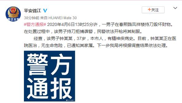 中新网4月6日电 成都市公安局锦江分局6日发布警方通报称,2020年4月6日13时25分许,一男子在春熙路凤祥楼持刀毁坏财物。在处置过程中,该男子持刀拒捕袭警,民警依法开枪将其制服。