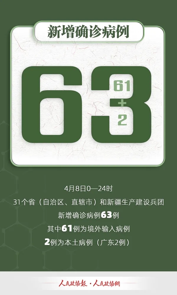 4月8日0—24时,31个?。ㄗ灾吻?、直辖市)和新疆生产建设兵团报告新增确诊病例63例,其中61例为境外输入病例,2例为本土病例(广东2例);新增死亡病例2例(湖北2例);新增疑似病例17例,其中16例为境外输入病例,1例为本土病例(黑龙江1例)。当日新增治愈出院病例91例,解除医学观察的密切接触者1848人,重症病例减少13例。境外输入现有确诊病例729例(含重症病例31例),现有疑似病例71例。累计确诊病例1103例,累计治愈出院病例374例,无死亡病例。