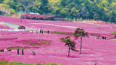 | 4月6日,江苏省句容市芝樱小镇400余亩芝?;叫胧⒒ㄆ?景区在做好疫情防控的基础上向游客开放。 钟学满 张映钢摄 |