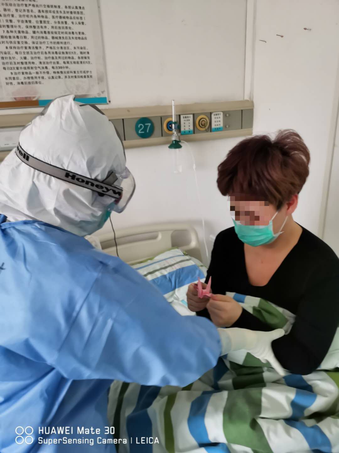2月14日西方情人节那天,王晓嘉和同事利用休息时间叠了38个千纸鹤。每张千纸鹤上都写着“早日康复,节日快乐”,由于没有专业用纸,原本一个小时就可以完成的事情,她们叠了一下午。她说虽然是一只小小的纸鹤,但却承载了医疗队队员们无限的祝福,“希望大家好好配合,在我们的陪伴下坚强、乐观,一起战胜病魔!” 她回忆当天好多病人收到后都激动地哭了,“我们也是强忍着眼泪?!庇胁∪顺鲈汉?,将千纸鹤小心翼翼的装进了包里带回家。