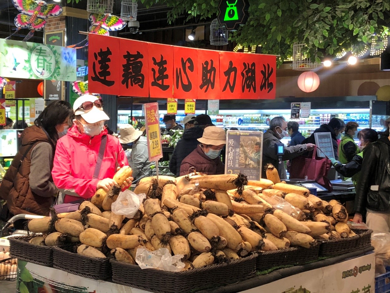 人民政协网北京4月12日电 (记者 贾宁 通讯员 王洁)4月12日,在北京超市发学院路店,几名顾客戴着口罩,正在挑选莲藕。淡黄色的莲藕枝节均匀而饱满,在货架上密密麻麻码放了很多层,供货充足,旁边的牌子上,红底黑字写着“莲藕连心,为湖北助力”。