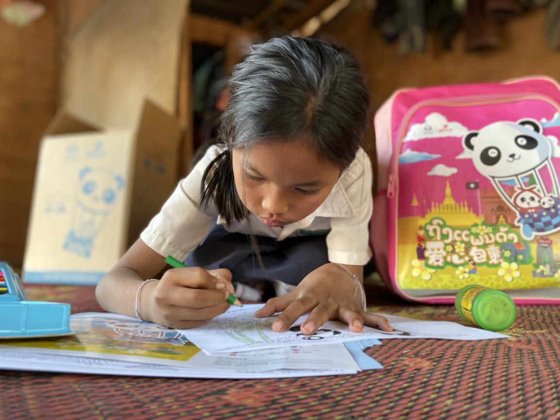 国际爱心包裹项目老挝受益学生正用包裹中的画笔画画