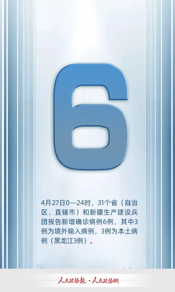 据国家卫健委消息,27日0时至24时,31个?。ㄗ灾吻?、直辖市)和新疆生产建设兵团报告新增确诊病例6例,其中3例为境外输入病例,3例为本土病例(黑龙江3例);无新增死亡病例;新增疑似病例1例,为境外输入疑似病例(上海1例)。