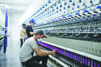 3月20日,新疆阿克苏地区乌什县华盛纺织有限公司车间内,工人们正在调试机器。曹敦斌摄/光明图片