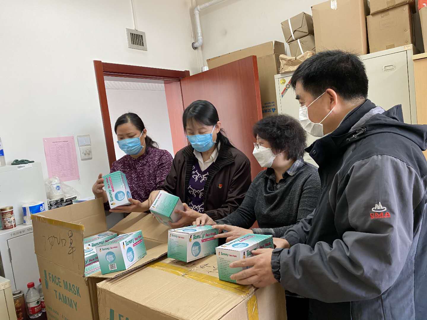 区侨联与区红十会工作人员接收和清点海外华人捐赠的口罩