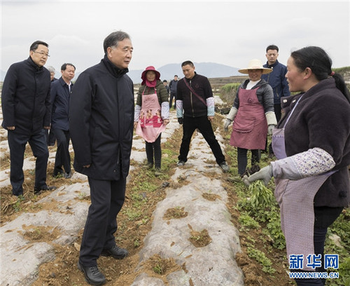 近日,中共中央政治局常委、全国政协主席汪洋在云南、贵州调研脱贫攻坚工作。这是4月25日,汪洋在贵州毕节市纳雍县寨乐镇辣椒种植基地与在田间劳作的农户交流,了解产业带动、农技培训、增收脱贫等情况。 新华社记者 王晔 摄