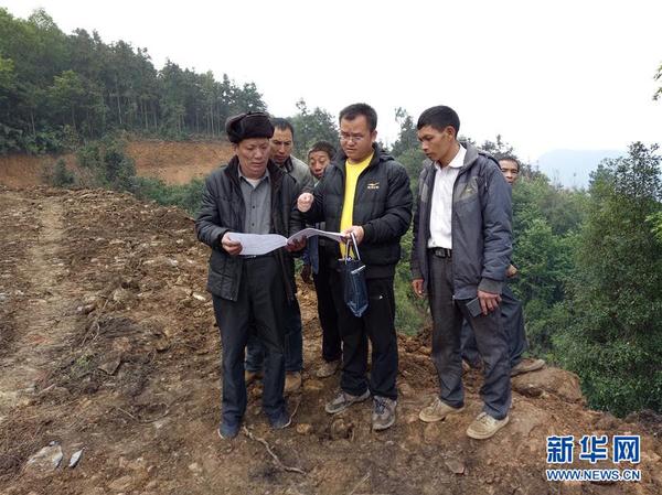 苏勇力(中)在加西村驻村时与村民商量开建通往三台屯的硬化路(资料照片)。新华社发