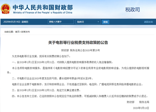 人民网北京5月14日电 据财政部官方网站消息,14日,财政部同税务总局联合发布电影等行业税费支持政策。自2020年1月1日至2020年12月31日,对纳税人提供电影放映服务取得的收入免征增值税。电影行业企业2020年度发生的亏损,最长结转年限由5年延长至8年。自2020年1月1日至2020年12月31日,免征文化事业建设费。公告如下: