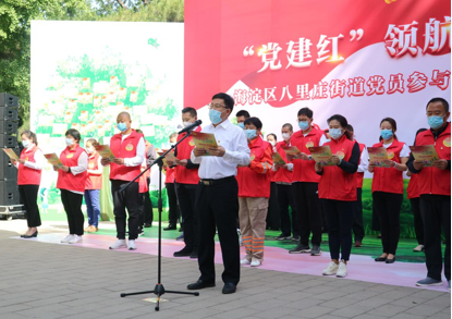 北京市海淀八里庄街道街道党工委书记曾涛带领着40名地区党员代表诵读《党员践行垃圾分类承诺书》