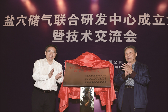 苏盐集团董事长、党委书记童玉祥与中国工程院院士罗平亚为“盐穴储气联合研发中心”揭牌