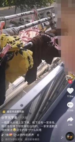 原来,“宇兄宇弟”家的儿子贪玩将一瓶墨水从高楼上泼下,楼下住户全遭了殃,他站在楼下邻居家的阳台拍下了“惨状”并感叹:一家家道歉还得找保洁,这生的是个什么玩意!