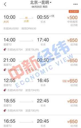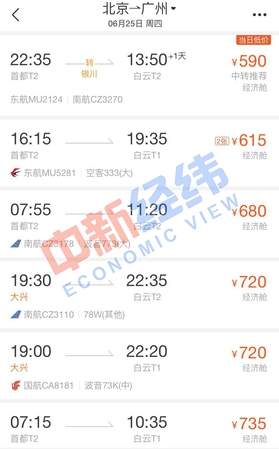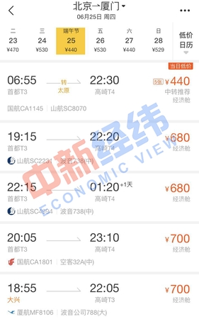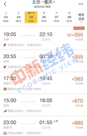 面对即将到来的端午节假期,即使没有买到高铁票也没关系。通过第三方售票平台发现,端午节当天,北京到多个城市的机票价格比高铁还实惠,个别航班甚至便宜超一半。