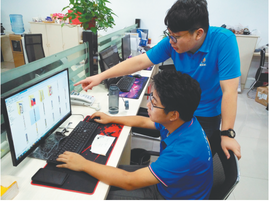 蔡亦扬(右一)和同事在探讨业务