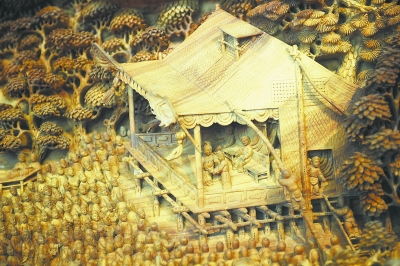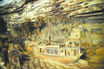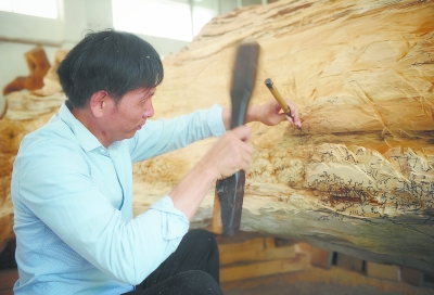 走进莆田市腾辉工艺厂,郑春辉正手执一刀一木锤,雕琢着《桃花源记》?!罢飧鑫恢貌闹视?,不用过多修饰,稍加打磨就能现出山中丹霞地貌状。”其间,他几次叫来身边的徒弟,作一番叮嘱。