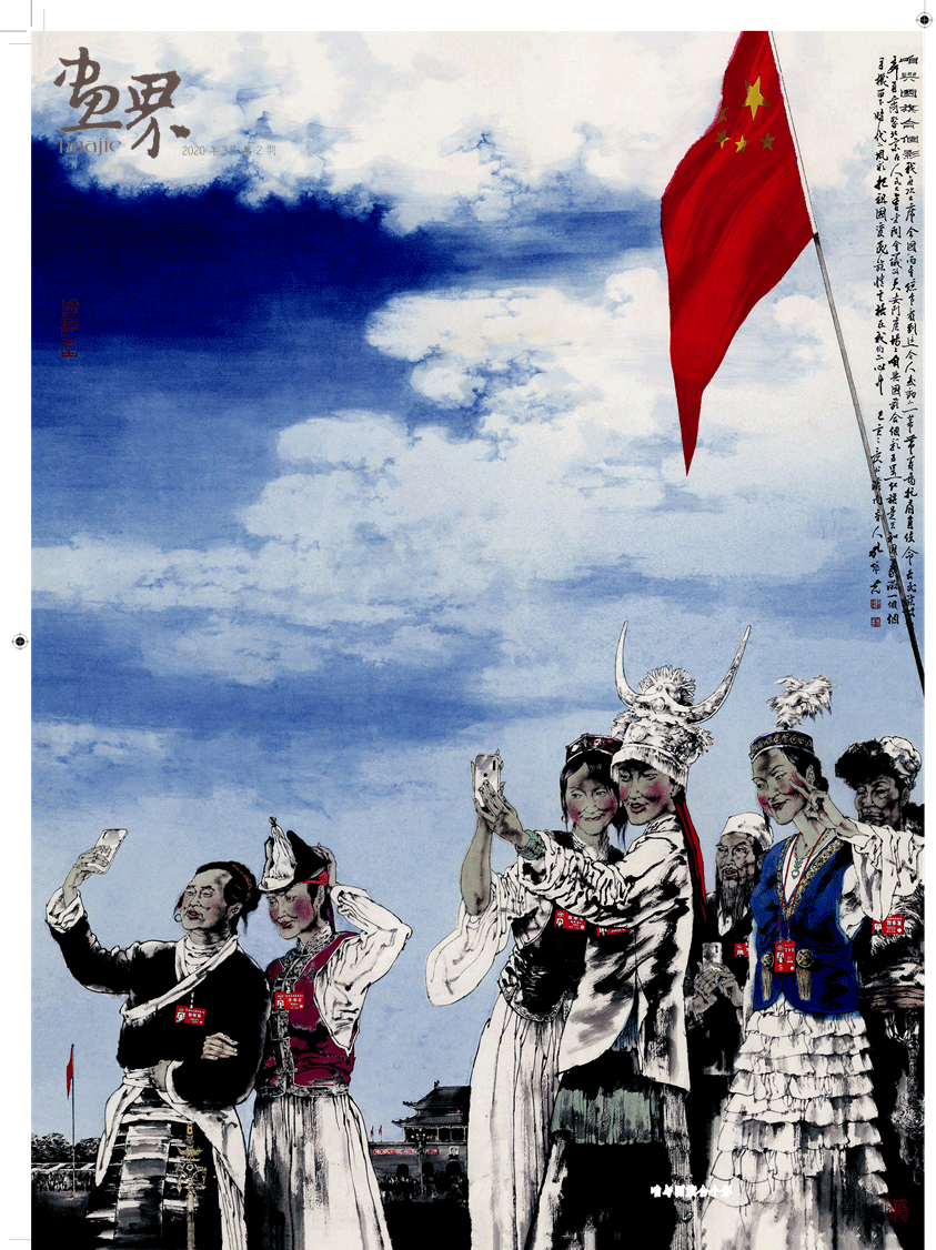 这次我依然采用小写意的手法来表现,在用笔上注意收与放、松与紧的节奏把握,画苗女身上的那几笔以草书写出的粗壮线条,与她银头饰的细节皴擦相对比;画藏族汉子的毛皮衣服的泼墨,与他腰间的配饰细腻相衬托;画姑娘裙摆的写意线条,与她领袖口花纹的刻划相比照,整个人物衣服的写意性与面部的工写结合,及胸章配饰的细腻刻划的不同表现等, 都呈现出丰富的视觉效果。另外,画面上部大片的天空是亮点也是难点。以前的中国画很少画天空,多以留白来解决,而我这幅画把人物压低所留出的大面积天空,就形成了一定的难度,因为留白处要画出蓝天白云,同时蓝白与红色可以形成鲜明的色彩对 比,更能突出红旗的鲜艳。