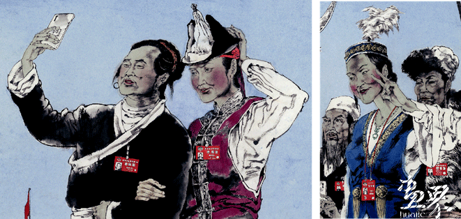 我迅速调出了多年来深入生活积累的素材,并利用信息时代资讯便捷的优势,短时间内实现了从内蒙草原到雪域高原、从西域边陲到南国苗寨的多民族形象自拍照片大传送。我要画“手机拍照”,这些人物形象也是用手机拍照后在第一时间用手机发送,图像信息在互联网中完成了瞬间沟通。