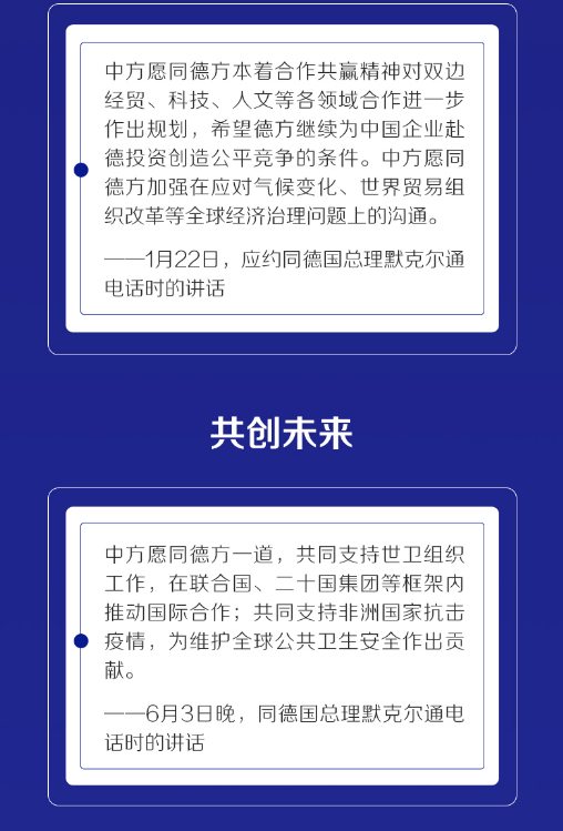 从1月提到“中德肩负着重要责任,两国合作已经超越双边范畴”,到3月称赞“中德、中欧展现出团结合作的力量,发挥了正能量”,再到6月表示“相信中德合作能够为促进世界早日走出经济衰退发挥应有作用”……言语之间,习近平都高度评价中德之间稳定良好的合作关系,并期望推动中德、中欧关系迈上新台阶。