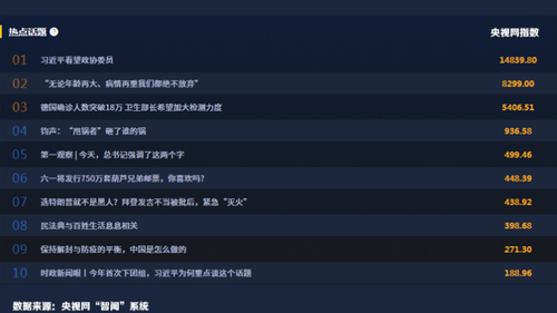 据央视网“智闻”系统“央视网指数”热度显示,5月23日,总书记参加全国政协经济界联组会后,该新闻迅速高居榜首。总书记在这次会议中对当前经济形势进行了客观理性的分析,并为下一阶段经济发展指明方向、提振信心。