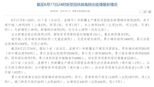 国家卫生健康委于18日在官网发布的《截至6月17日24时新型冠状病毒肺炎疫情最新情况》(以下简称“情况”)称,6月17日0—24时,31个?。ㄗ灾吻⒅毕绞校┖托陆ㄉ璞疟ǜ嫘略鋈氛锊±?8例,其中境外输入病例4例(上海2例,陕西1例,甘肃1例),本土病例24例(北京21例,河北2例,天津1例);无新增死亡病例;新增疑似病例3例,均为本土病例(均在北京)。当日新增治愈出院病例15例,解除医学观察的密切接触者153人,重症病例增加2例。境外输入现有确诊病例91例(无重症病例),无现有疑似病例。累计确诊病例1860例,累计治愈出院病例1769例,无死亡病例。