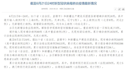 国家卫生健康委于22日在官网发布的《截至6月21日24时新型冠状病毒肺炎疫情最新情况》(以下简称“情况”)称,6月21日0—24时,31个?。ㄗ灾吻?、直辖市)和新疆生产建设兵团报告新增确诊病例18例,其中境外输入病例7例(上海3例,陕西2例,天津1例,辽宁1例),本土病例11例(北京9例,河北2例);无新增死亡病例;新增疑似病例2例,均为本土病例(均在北京)。当日无新增治愈出院病例,解除医学观察的密切接触者144人,重症病例与前一日相比减少3例。