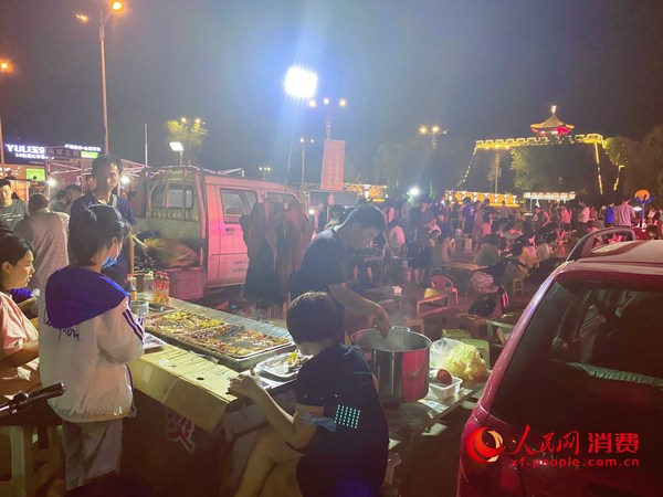 6月19日,人们在山西晋中榆次区桥头美食夜市吃宵夜。