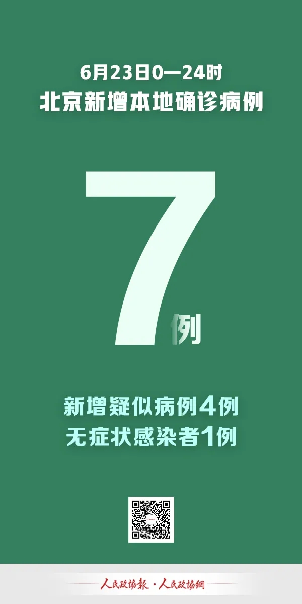 6月23日0时至24时,北京新增报告本地确诊病例7例、疑似病例4例、无症状感染者1例;无新增报告境外输入确诊病例、疑似病例、无症状感染者。