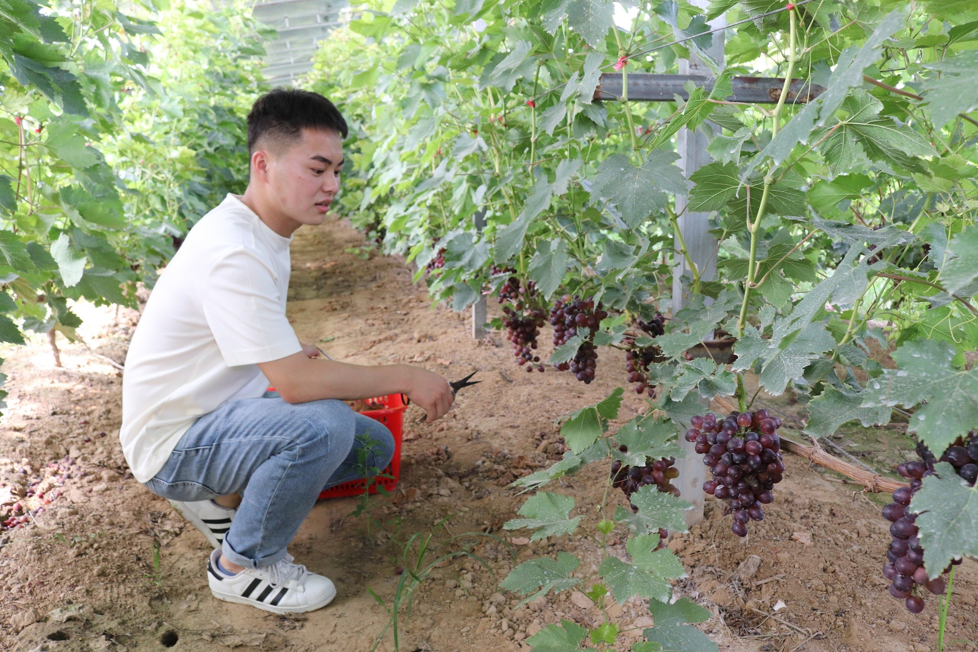 图为海子崖社区党总支书记李连明在自摘园里采摘葡萄