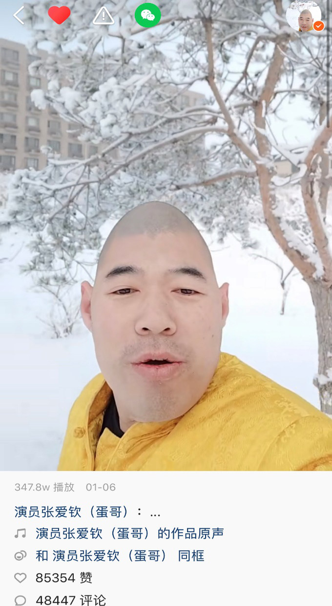 但一开始,“蛋哥”也没想到视频会火。今年1月6日,“蛋哥”将这则视频上传至快手。对于张爱钦来说,这不是一个特别的视频:在他的快手账号中,多为自拍视角,拍摄这条时,他只是把往常的聊天,变成了唱歌。