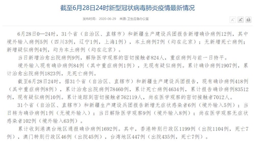 国家卫生健康委于29日在官网发布的《截至6月28日24时新型冠状病毒肺炎疫情最新情况》(以下简称“情况”)称,6月28日0—24时,31个省(自治区、直辖市)和新疆生产建设兵团报告新增确诊病例12例,其中境外输入病例5例(四川3例,辽宁1例,上海1例),本土病例7例(均在北京);无新增死亡病例;新增疑似病例4例,均为本土病例(均在北京)。当日新增治愈出院病例9例,解除医学观察的密切接触者824人,重症病例与前一日持平。境外输入现有确诊病例84例(其中重症病例1例),无现有疑似病例。累计确诊病例1907例,累计治愈出院病例1823例,无死亡病例。