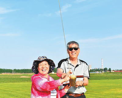 赵鸿斌夫妇在放风筝。人民日报记者 毕京津摄