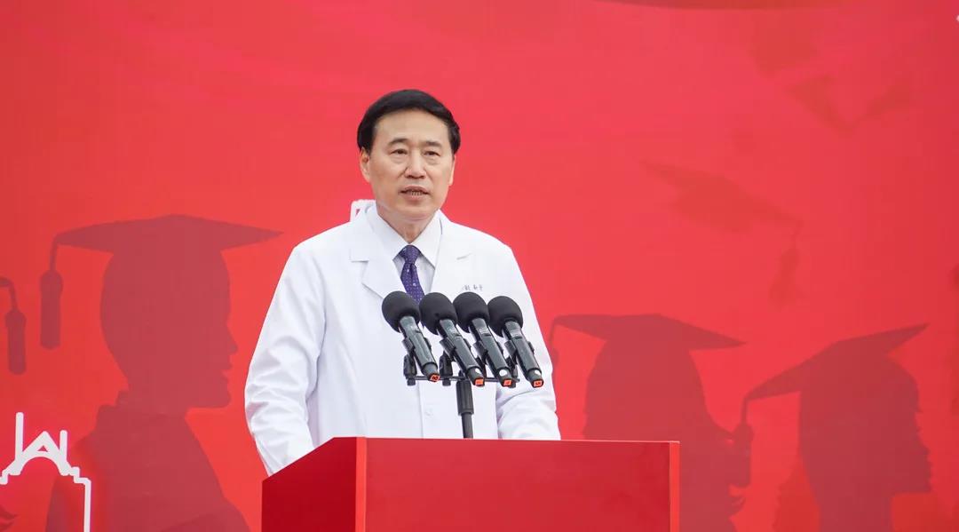 詹启敏为即将踏上征程的学子们送上了母校的嘱托与祝福。第一是以德立身,仁心为本。中国自古以来就有“大医精诚”的理念。所谓医者,一是要“精”,即要有丰富的医学知识和精湛的医疗技术;二是要诚,即要有高尚的品德修养和厚重的人文情怀。医术与医德是医学的一双翅膀,希望同学们未来能够学会奉献、学会助人、学会宽容、学会自省、学会自律。第二是志存高远,奋斗前行。从百年来北医人的故事中,不仅可以看到他们的勇气与担当、执着与坚守,更应该向他们学习将个人志向与国家和人民的需求紧密联系的远大理想和家国情怀。同学们生逢其时,也重任在肩,理应铸理想、练本领、强担当,争做堪当大任的新一代。将个人奋斗融入新时代发展的潮流中,让青春之花在党和人民最需要的地方绚丽绽放。第三是学无止境,与时俱进。面对百年未有之大变局,面对瞬息万变的国际局势、面对日新月异的医学发展,面对医学领域无所不在的不确定性,单一学科的方法已经无法一劳永逸解决问题,抗击新冠肺炎疫情的过程就很好地证明了这一点。希望同学们常学多学,培养系统性、全链条思维,发挥跨学科交叉优势,加强学科间交流与合作,携手面对现代医学的困境与挑战。