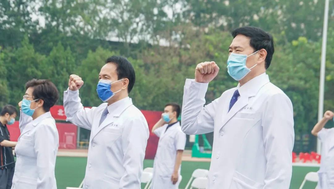 在即将出征之际,徐善东和北大医学国家援鄂医疗队“90后”党员代表吴超、王奔,毕业生代表一起,带领大家重温医学生誓言,“奋斗终生”的初心在所有通过线上线下观看活动的医学生心间回响。