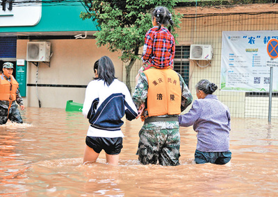 | 6月28日,重庆涪陵区救援队员正在转移被困老人和小孩。 黄春红摄(人民视觉) |
