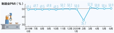 6月制造业采购经理指数为50.9%,连续4个月在荣枯线上