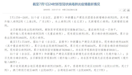 国家卫生健康委于今日在官网发布的《截至7月1日24时新型冠状病毒肺炎疫情最新情况》(以下简称“情况”)称,7月1日0—24时,31个省(自治区、直辖市)和新疆生产建设兵团报告新增确诊病例3例,其中境外输入病例2例(上海1例,广东1例),本土病例1例(在北京);无新增死亡病例;无新增疑似病例。当日新增治愈出院病例8例,解除医学观察的密切接触者754人,重症病例与前一日持平。